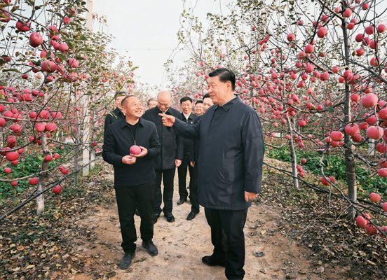 2022年10月26日至28日,中共中央总书记、国家主席、中央军委主席习近平在陕西省延安市、河南省安阳市考察。这是26日下午,习近平在延安市安塞区高桥镇南沟村苹果园同老乡们亲切交流。 新华社记者 燕雁/摄