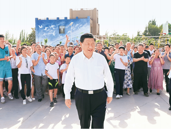 2022年7月12日至15日,中共中央总书记、国家主席、中央军委主席习近平在新疆考察。这是14日,习近平在吐鲁番市高昌区亚尔镇新城片区新城西门村考察时,同各族群众在一起。 新华社记者 李学仁/摄