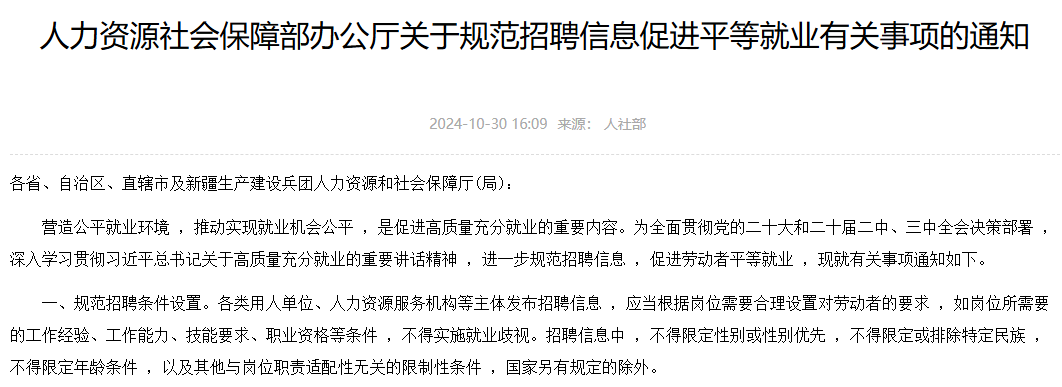 人力资源社会保障部办公厅关于规范招聘信息促进平等就业有关事项的通知